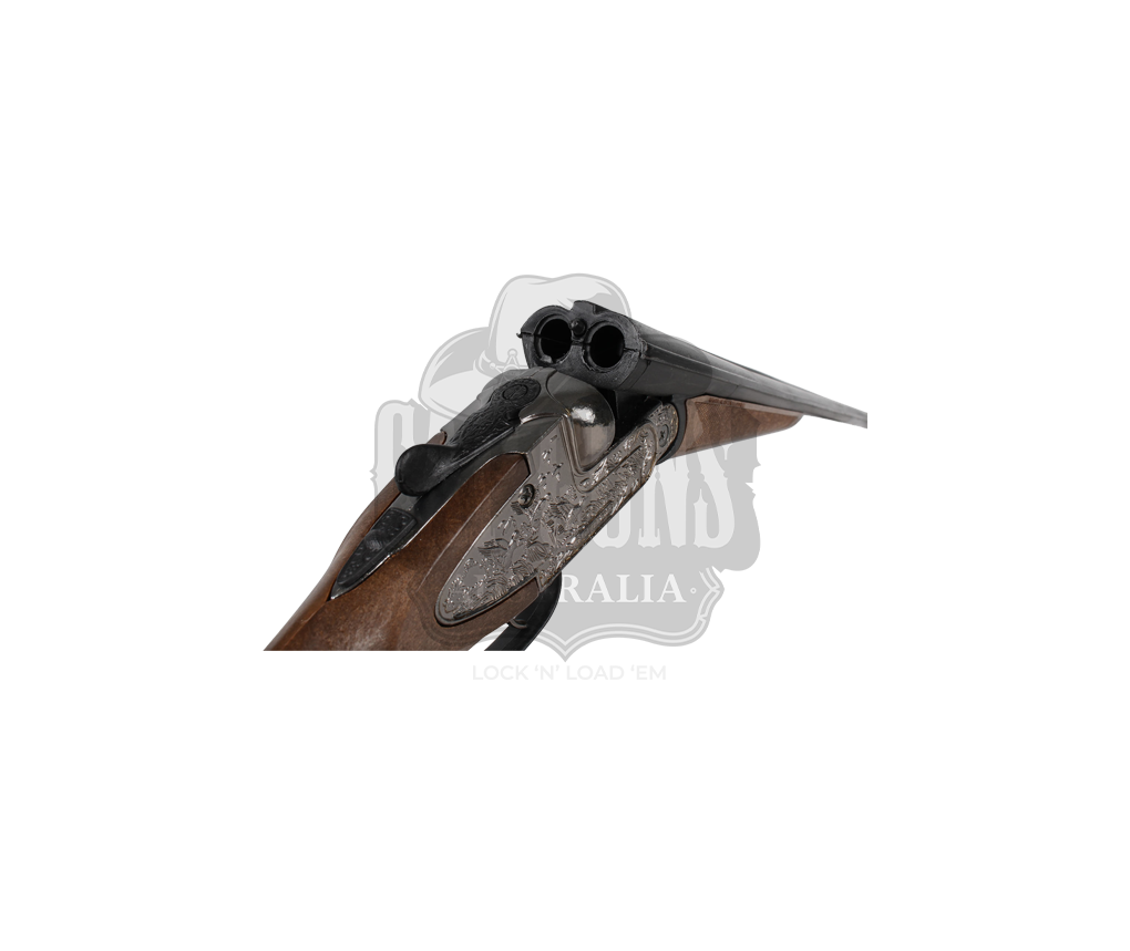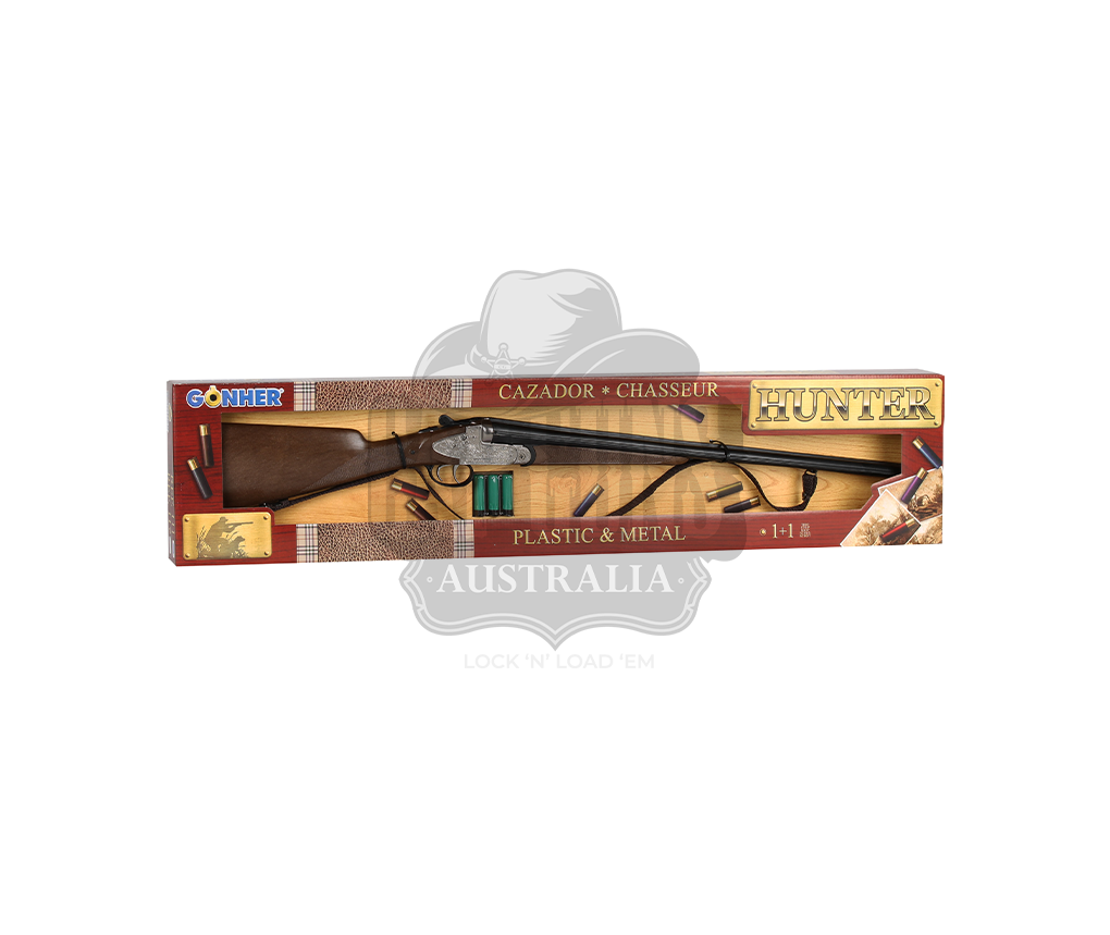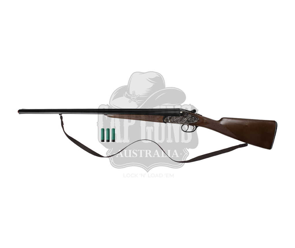 Metal hunter parallel shotgun with 3 cartridges and brown strap. It uses caps 1 +1 shots, made in Spain.