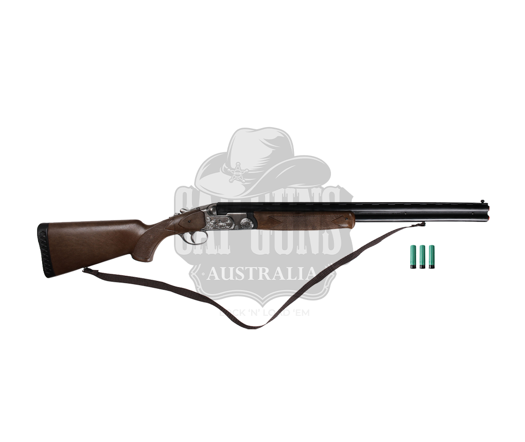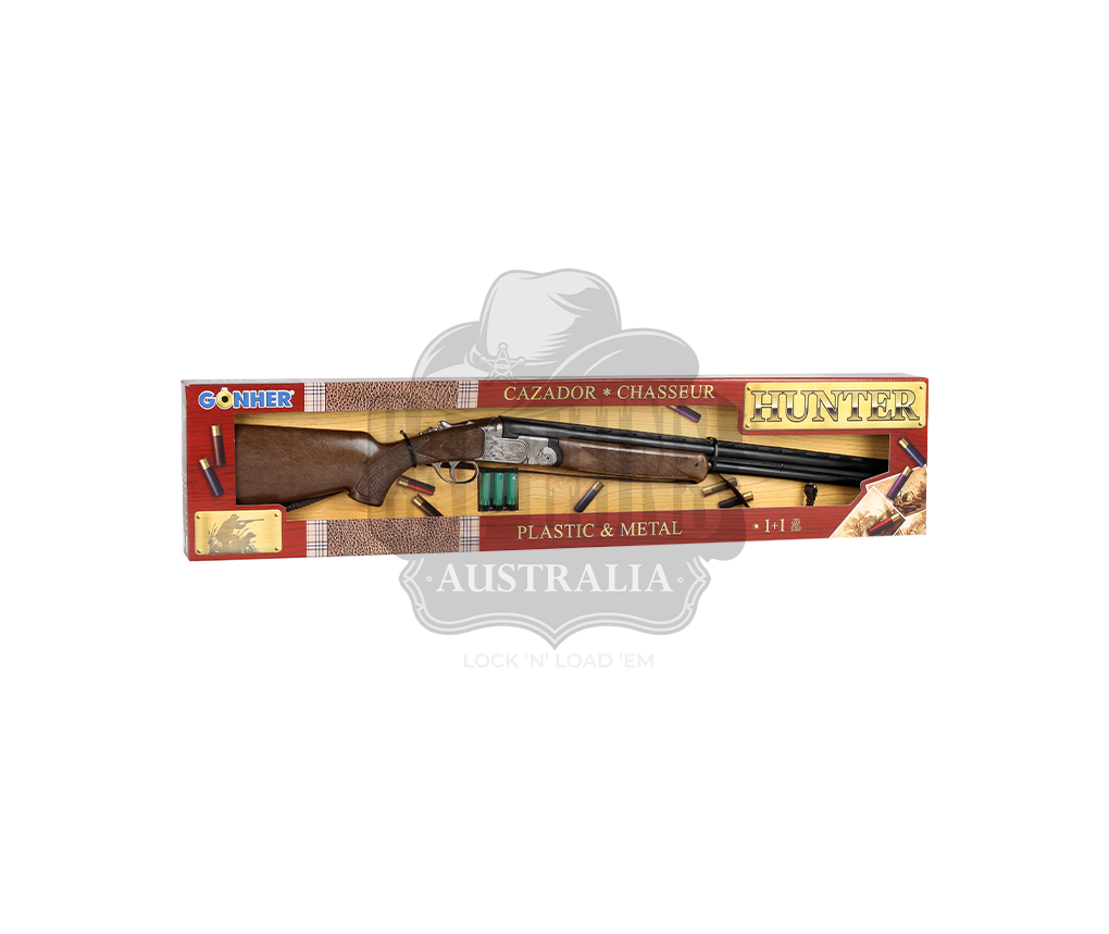 Metal hunter Superimposed shotgun with 3 cartridges and brown strap, It uses caps 1 +1 shots, made in Spain.