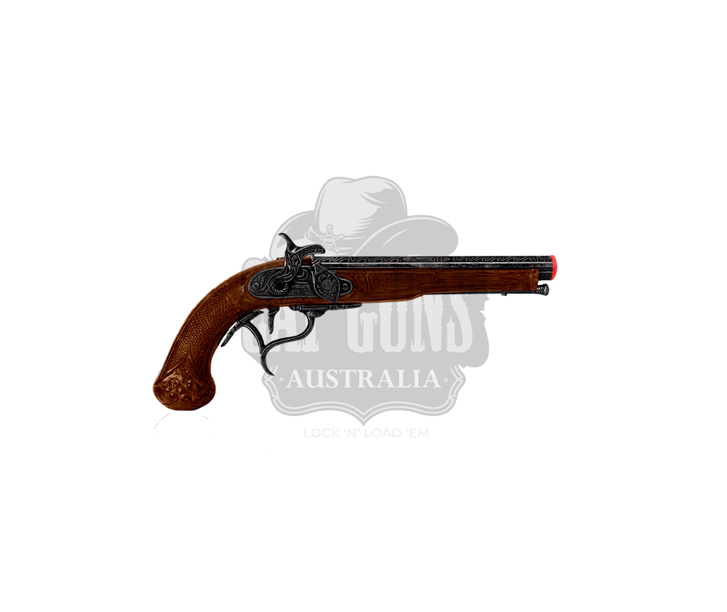 Step back into a time of powdered wigs, polished boots, and honour-bound duels with this 18th century percussion pistol replica by Kolser. Inspired by the sleek duelling pistols once wielded by European nobility, this finely crafted piece captures the elegance and tension of a time when disputes were settled at dawn—with a single shot.