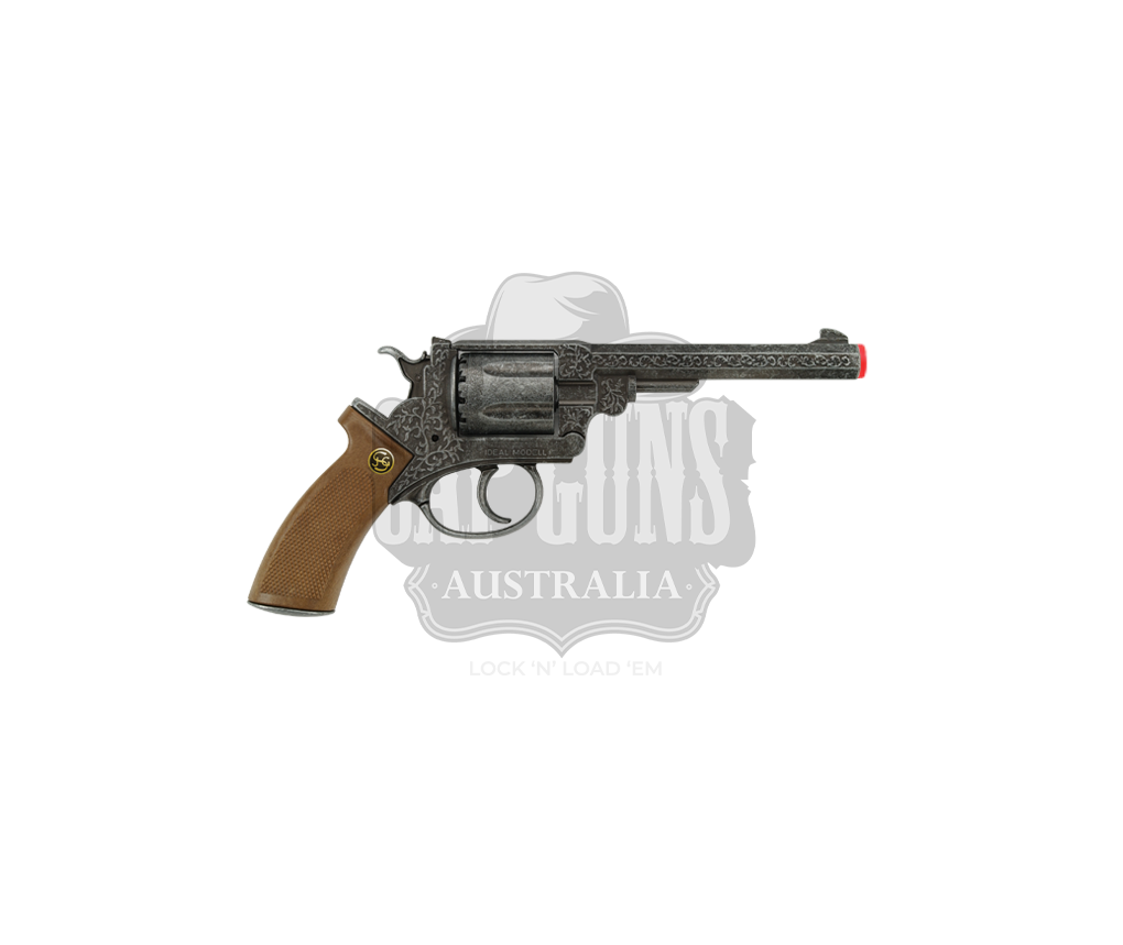 12-shot antique silver revolver with brown grip, 25 cm, made of zinc and plastic. From 8 years old.