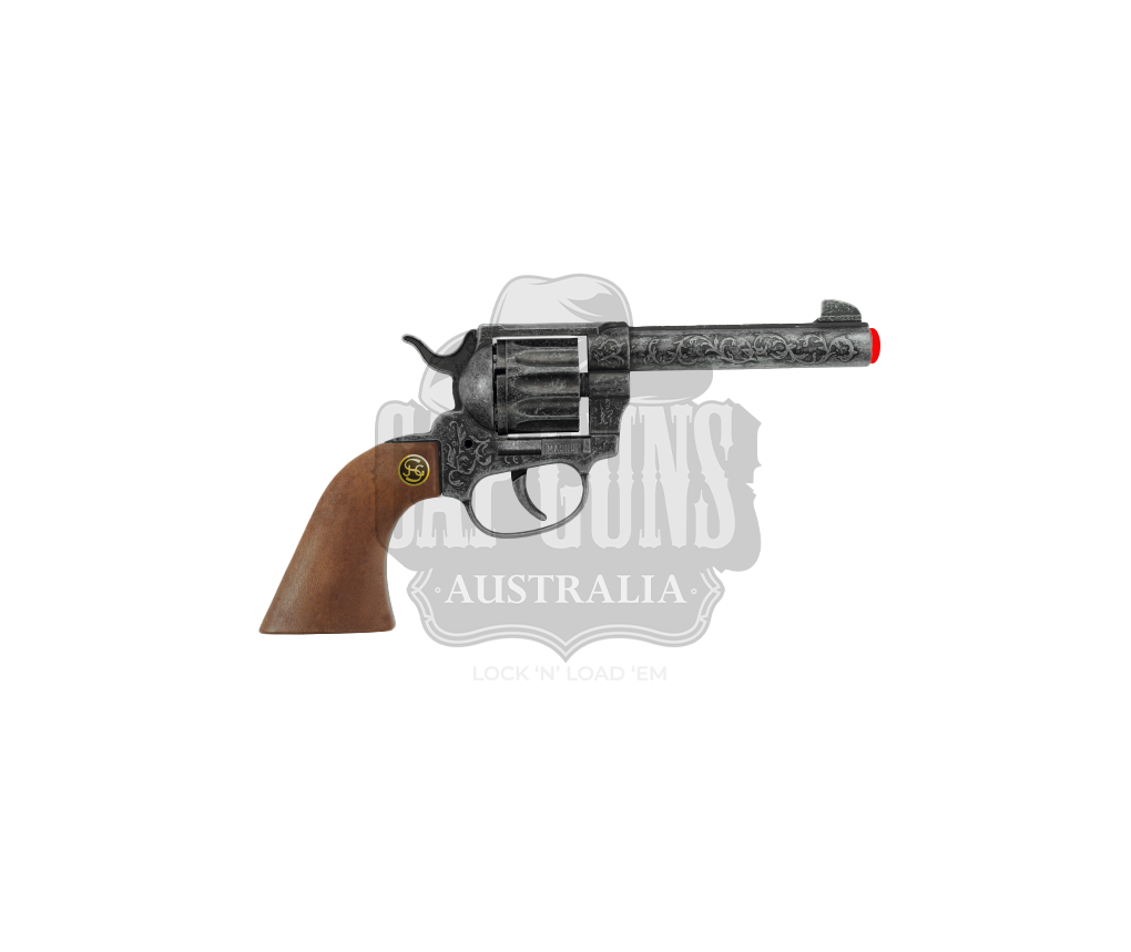 12-shot antique silver revolver with brown grip, 22 cm, made of zinc and plastic. From 6 years.