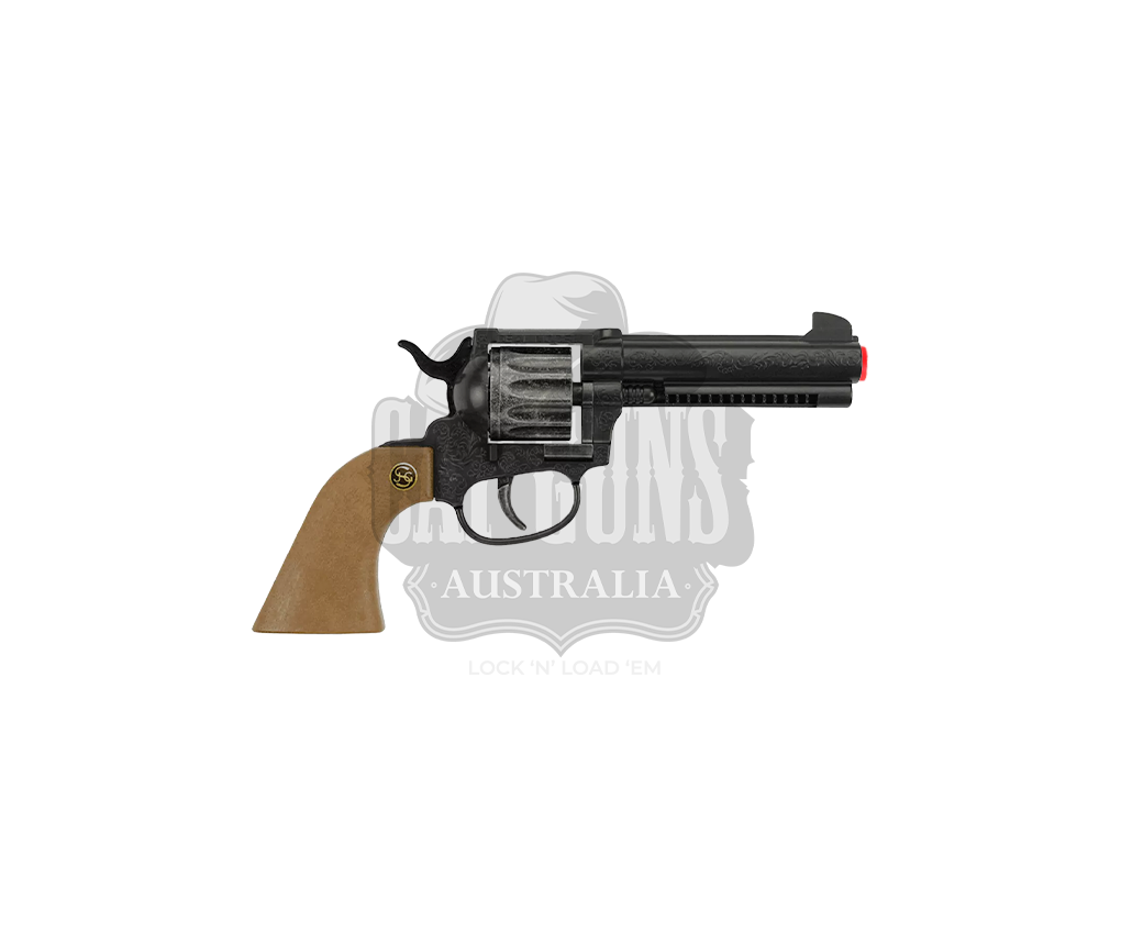12 shot pistol black with brown grip, 22.5 cm made of plastic and zinc. From 3 years.